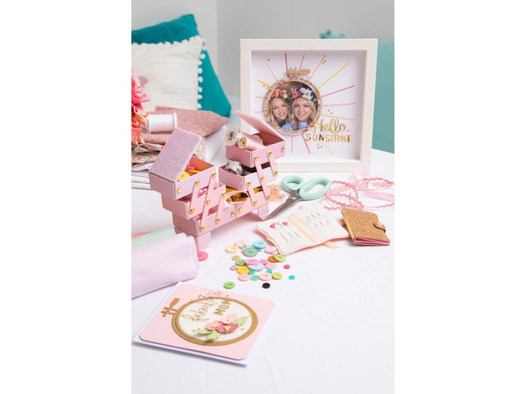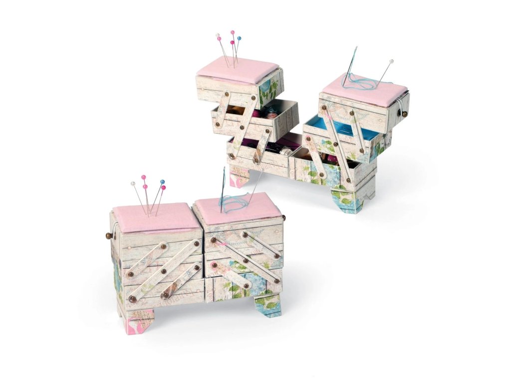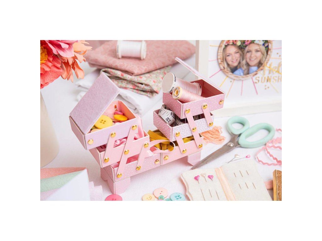Kovová vyřezávací šablona Cantilever Sewing Box z řady Scoreboards XL od Sizzix umožňuje snadno a přesně vyrobit krabičku na šicí potřeby s víkem a rozkládacími přihrádkami. Perfektní pro scrapbooking, cardmaking nebo jako praktický úložný box pro malé předměty a doplňky.