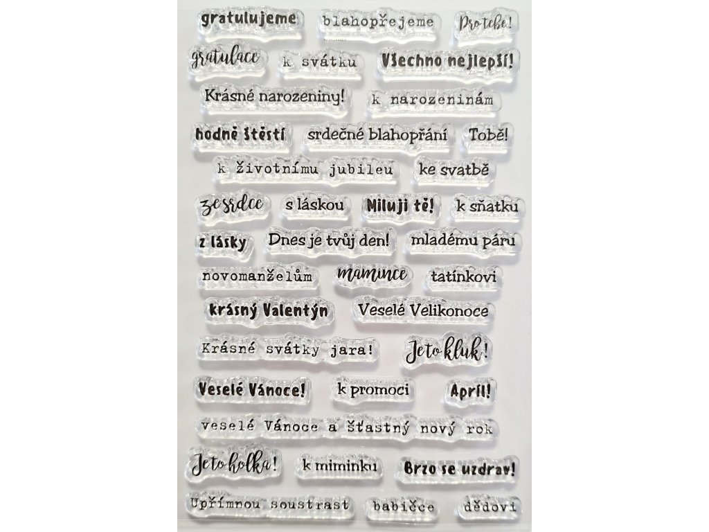 Velikost sady 10 x 15 cm; 38 ks razítek. Horní motiv "gratulujeme" je velký 2,6 x 0,4 cm.