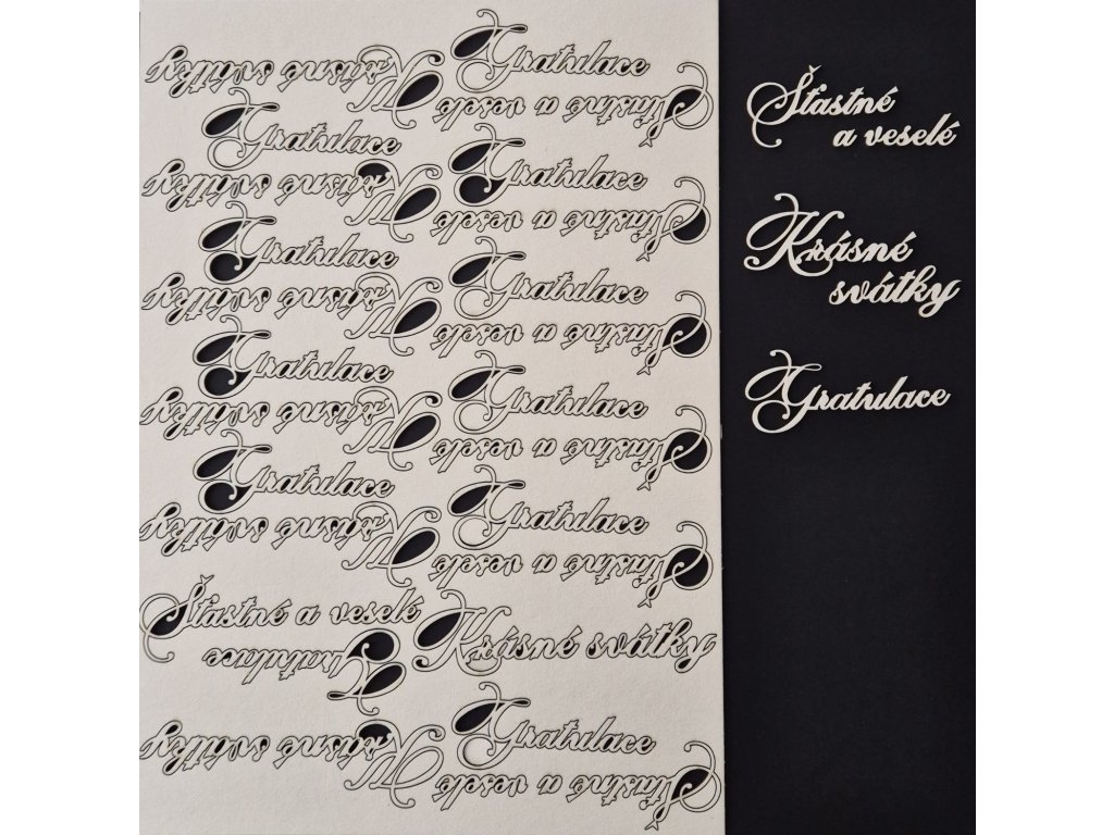 Arch A4; nápis "KRÁSNÉ SVÁTKY"/ 7 ks je velký 6 x 3 + 4,6 x 2 cm + "ŠŤASTNÉ A VESELÉ"/ 7 ks 5,4 x 3 + 3,5 x 1,3 cm, "GRATULACE" / 11 ks 7,3 x 3 cm. Vyřezáno z kartonu o šíři 1,5 mm.