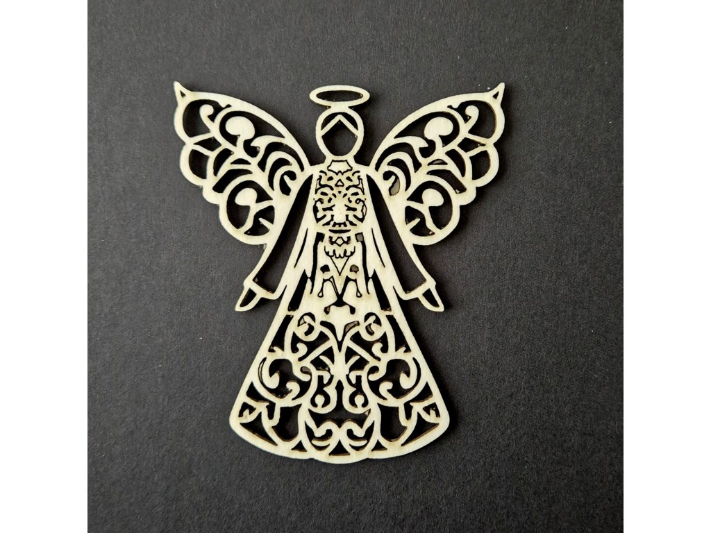 Andělka je velká 7 x 8 cm; vyřezáno z kartonu o šíři 1,5 mm.