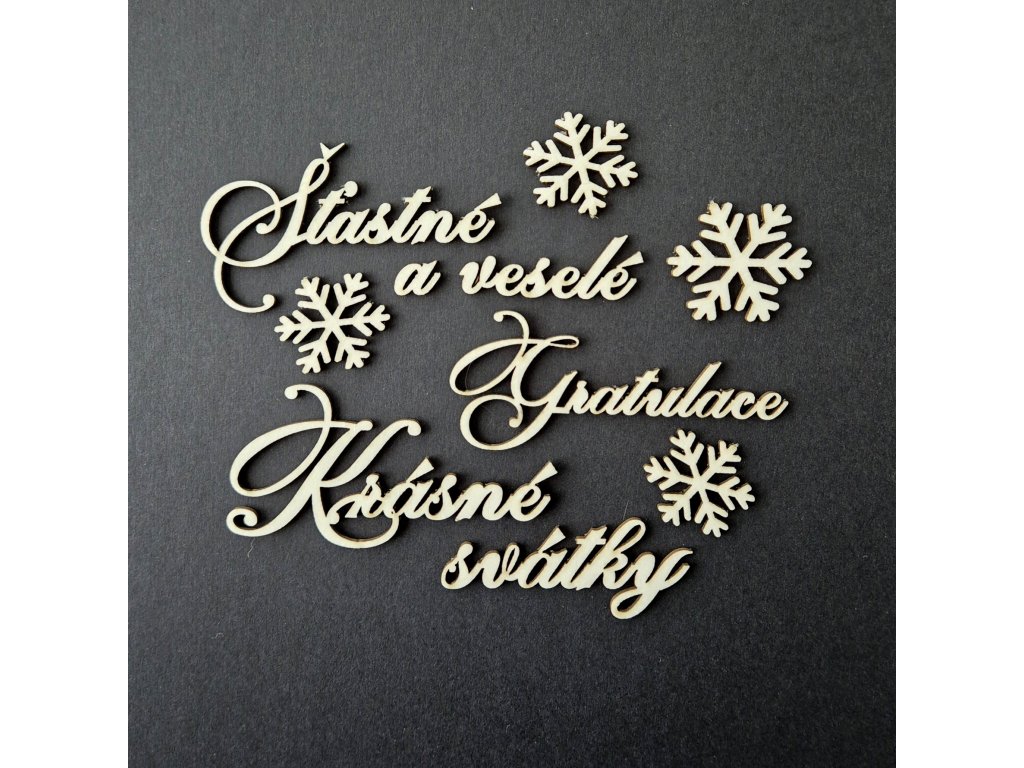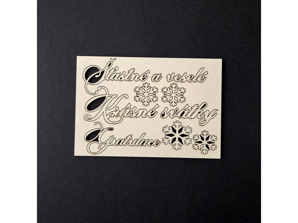 Kartička 9,5 x 13 cm; nápis "KRÁSNÉ SVÁTKY" je velký 7 x 3,2 + 5,3 x 2 cm + "ŠŤASTNÉ A VESELÉ" 6,2 x 3,5 + 4 x 1,4 cm, "GRATULACE" 7,3 x 3 cm. Vyřezáno z kartonu o šíři 1,5 mm.