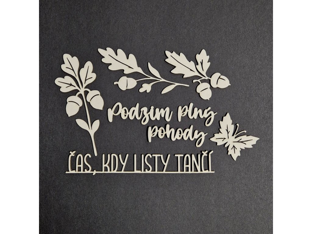 Nápis "ČAS, KDY LISTY TANČÍ" je velký 11,7 x 1,7 cm; "Podzim" 5,1 x 1,5 cm; motýlek 3,5 x 2,7 cm; velká větvička 3 x 8,4 cm; vyřezáno z kartonu o šíři 1,5 mm.