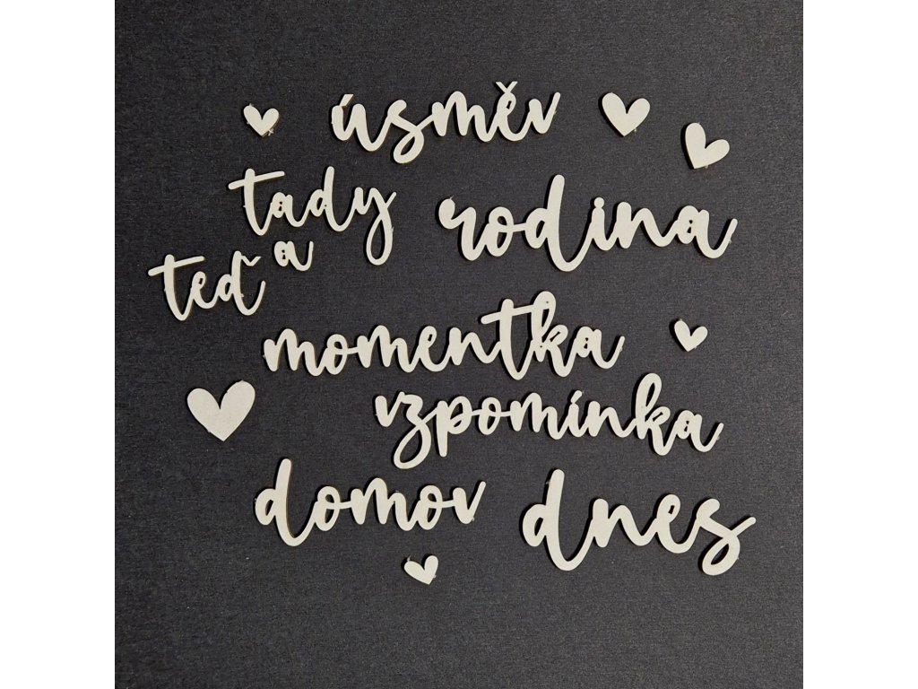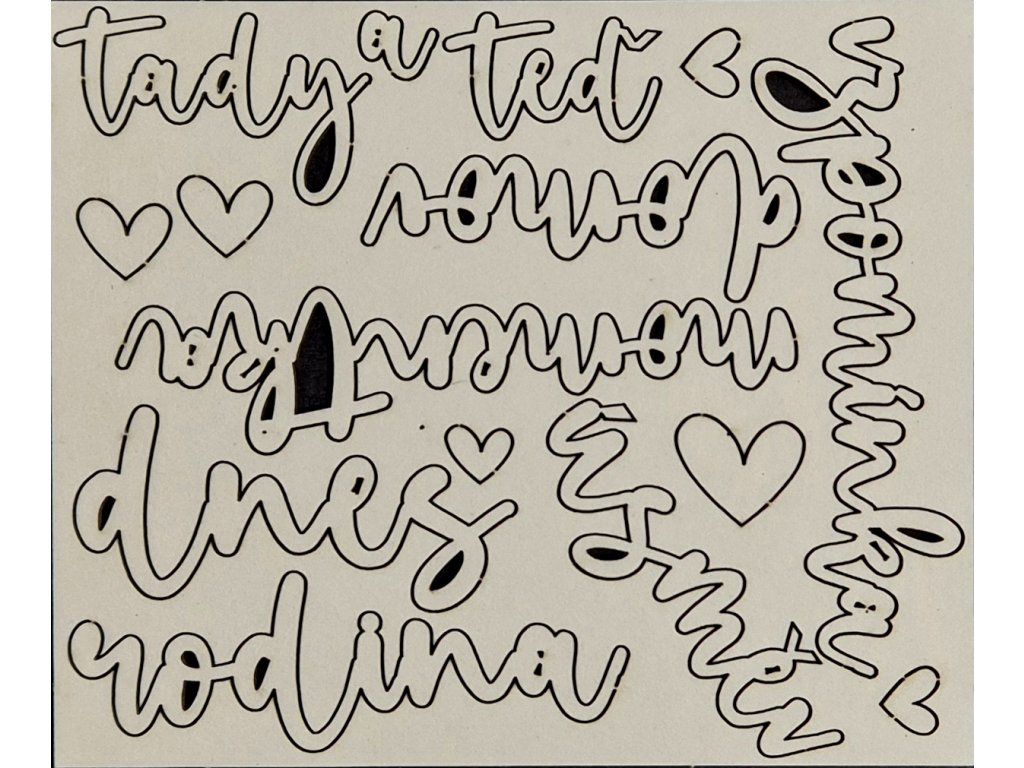 Arch 12 x 10 cm, slovo "rodina" je velké 7,3 x 2,4 cm. Z archu motivy lehce "vyloupete".