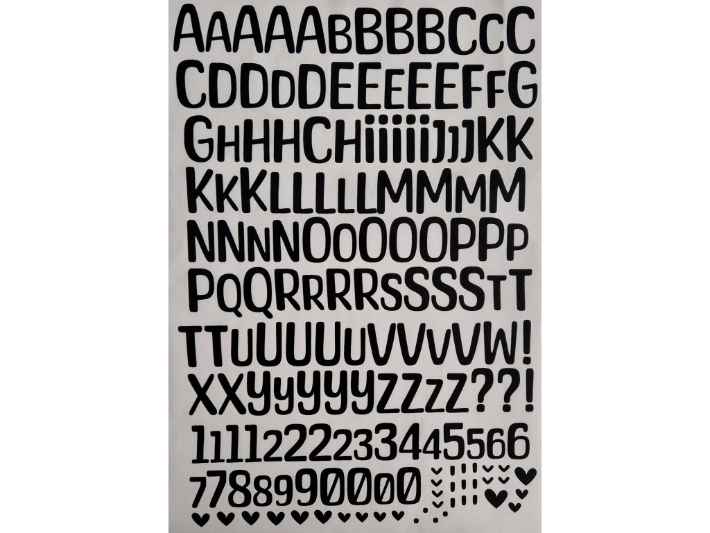 Arch 21 x 29,8 cm; výška jednotlivých písmen je 2,3 nebo 2 cm. Písmenka nemají bílé okraje.