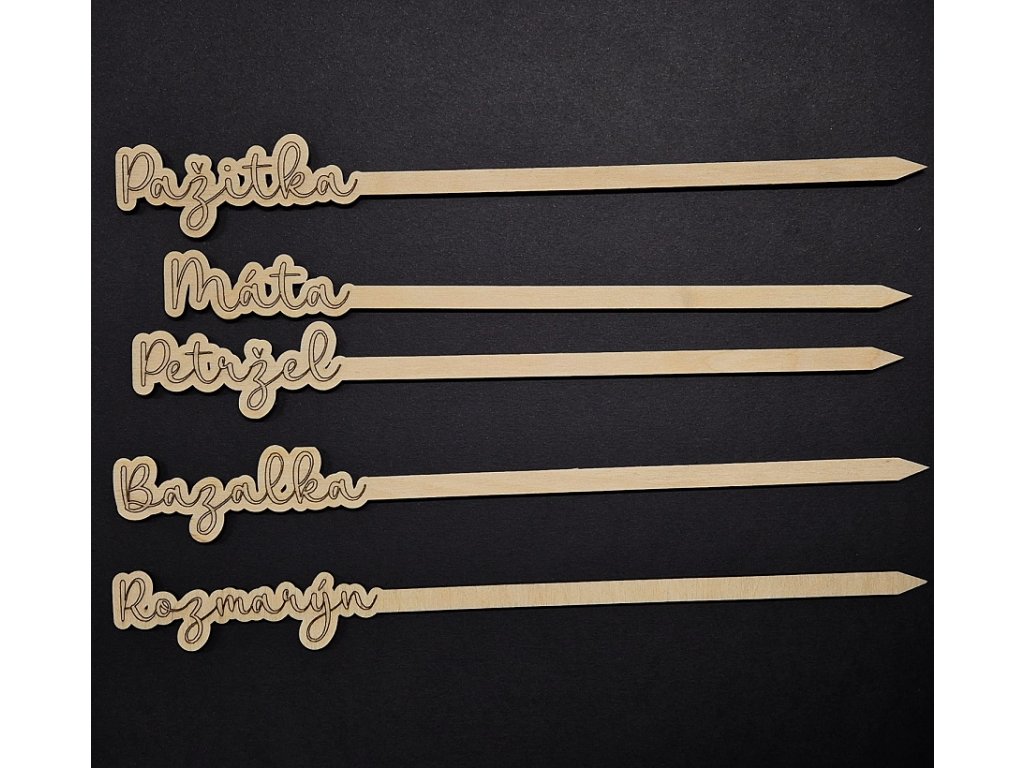 Praktické a dekorativní zápichy do květináče s názvy bylinek, vyřezané laserem z kvalitní březové překližky o tloušťce 3 mm. Pomohou vám snadno označit jednotlivé rostliny a zároveň krásně doplní vzhled bylinkového truhlíku.