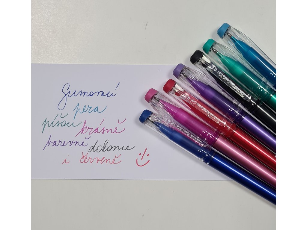 Gumovací pero s uzávěrem a termo citlivým mazatelným inkoustem. Pouhým otřením inkoustové linky víčkem pera se vygeneruje dostatek tepla, aby vymazalo linku.