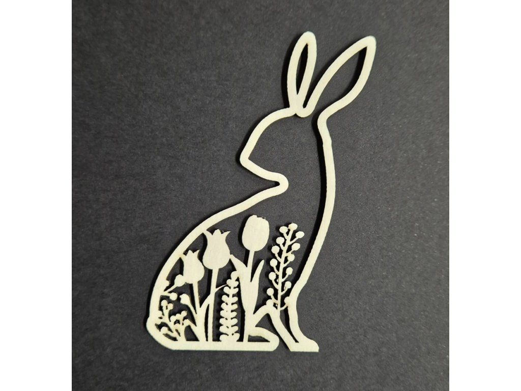 1 ks; zajíc je velký 5,6 x 8 cm. Výsek je řezaný laserem z 1,5 mm lepenky, obě strany jsou světlé.
