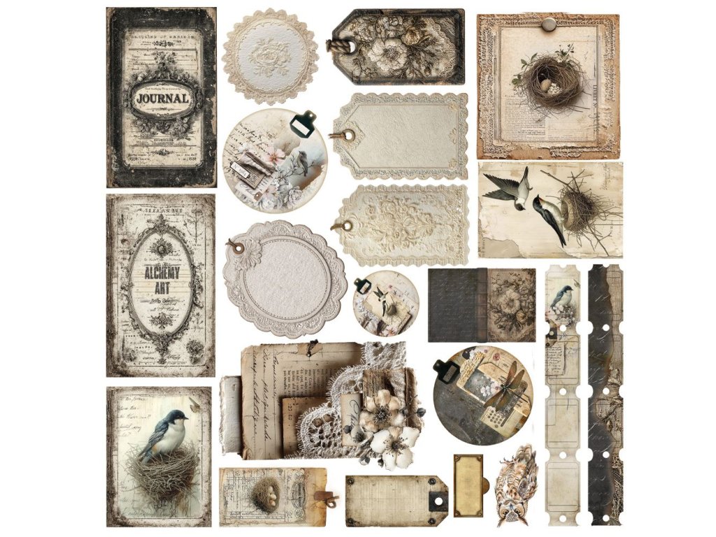 Dekorativní látkový arch k vystřihování, určený pro kreativní tvoření, art journaling, textilní koláže a mixed-media projekty.