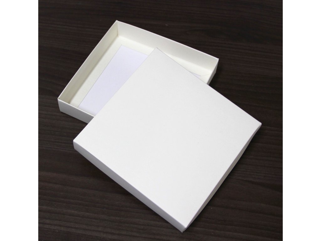 Krabičky jsou vyrobeny z pevného kartonu. Jsou rozložené, lehce do víčka vyříznete průhled a pod. Zadní strana je bílá.