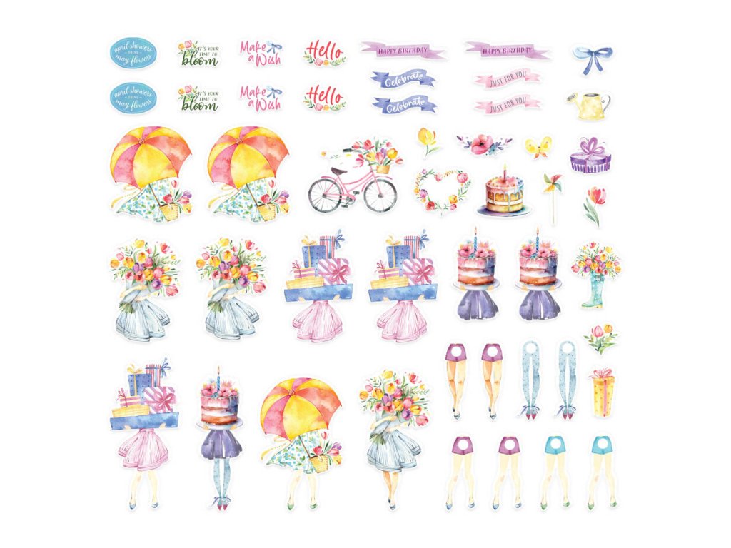 Součástí balení jsou nejen taneční prvky, ale také nápisy pro oslavu nejrůznějších příležitostí, jarní květiny, mašle a další. Všechny prvky mají jemný, strukturovaný vzhled, který napodobuje akvarelové barvy. S touto krásnou sadou vytvoříte zábavné a snadno pohyblivé přáníčka během chvilky.