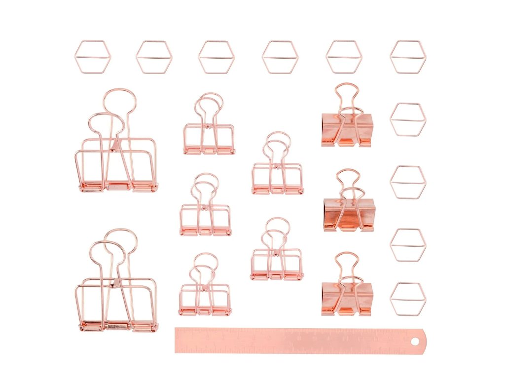 Pomocí binder klipů a geometrických kancelářských sponek snadno sepnete hromádku papírů – přáníčka, vstupenky, koláže, fotografie, kresby, skici a další materiály. Klipy můžete využít i jako dekoraci do kreativního koutku nebo pracovny – díky elegantní růžovo-zlaté (rose gold) barvě jsou skutečným poutačem.