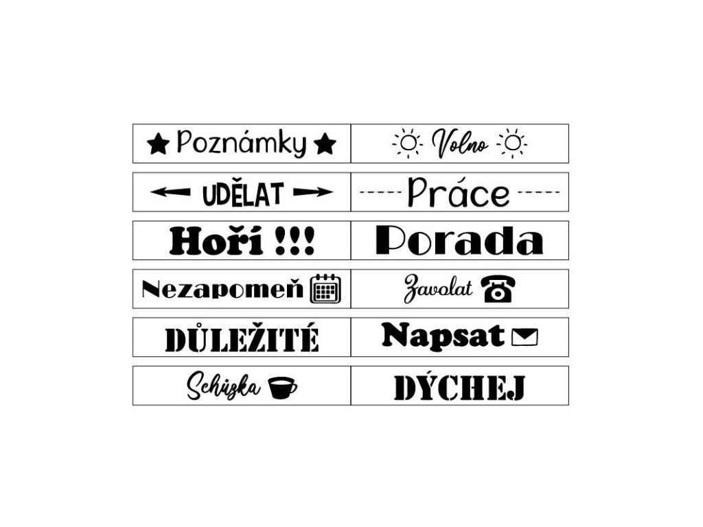 12 nápisů v češtině; velikost jednotlivých slov cca 2,8 x 6 mm.