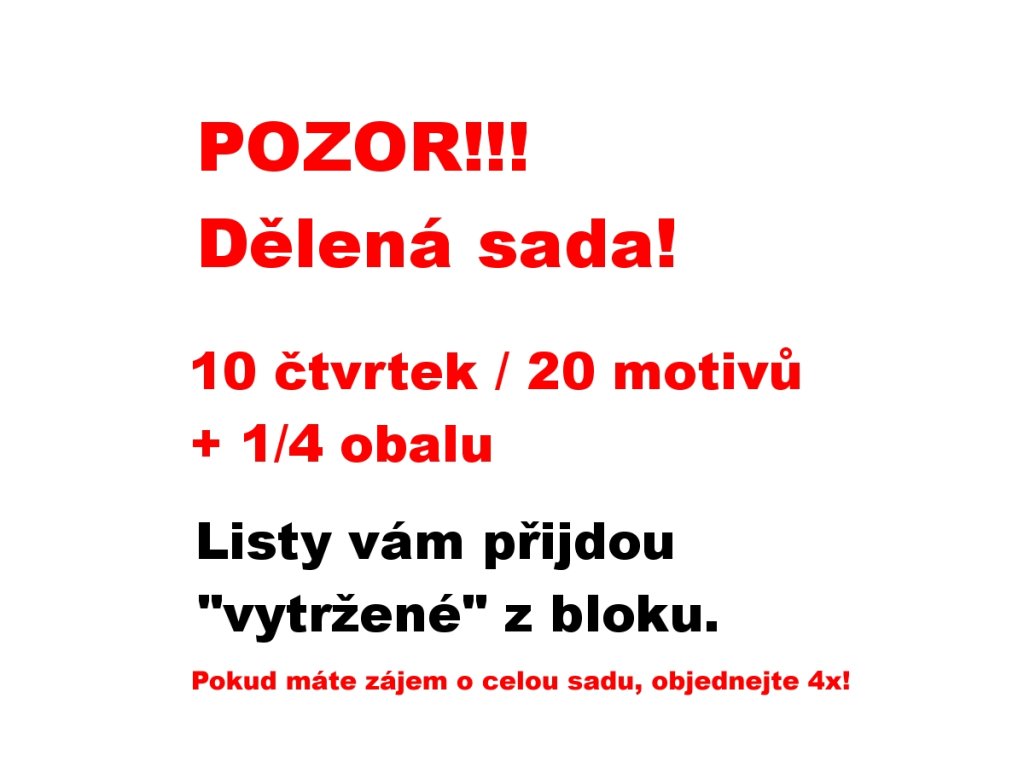 Sada je dělená, pokud máte zájem o komplet vč. 2 bonusových stran, objednejte prosím 4 ks. Okraje nemusí být 100%.