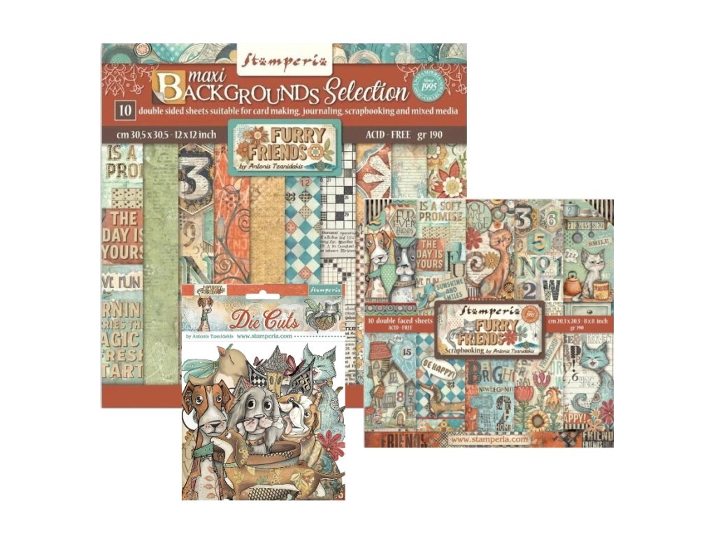 KE KURZU MAZLÍČCI - Stamperia - Furry Friends - sady 8x8" + 12x12" + kartonové obrázky