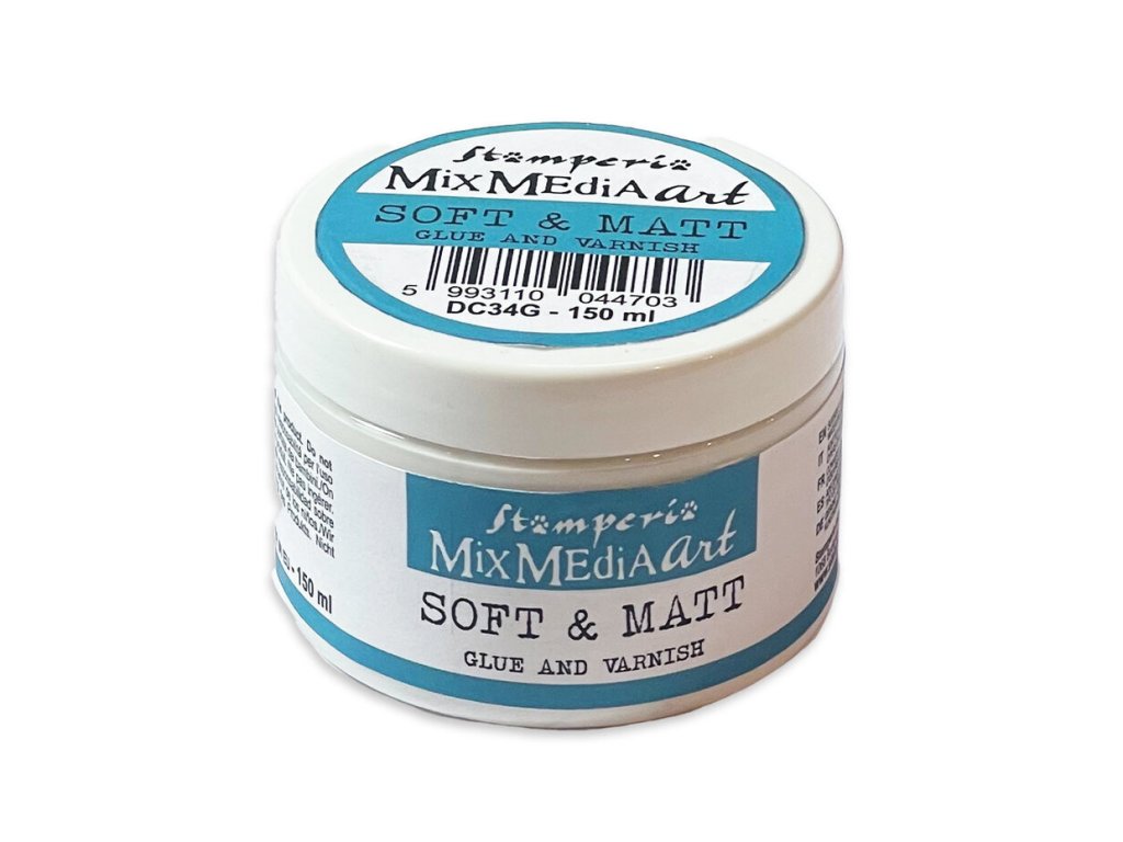 Soft & Matt Glue & Varnish od Stamperie je univerzální lepidlo a matný lak v jednom, ideální pro decoupage, scrapbooking, cardmaking a další kreativní techniky. Má jemnou konzistenci, snadno se roztírá a po zaschnutí vytváří sametově matný povrch bez lesku.