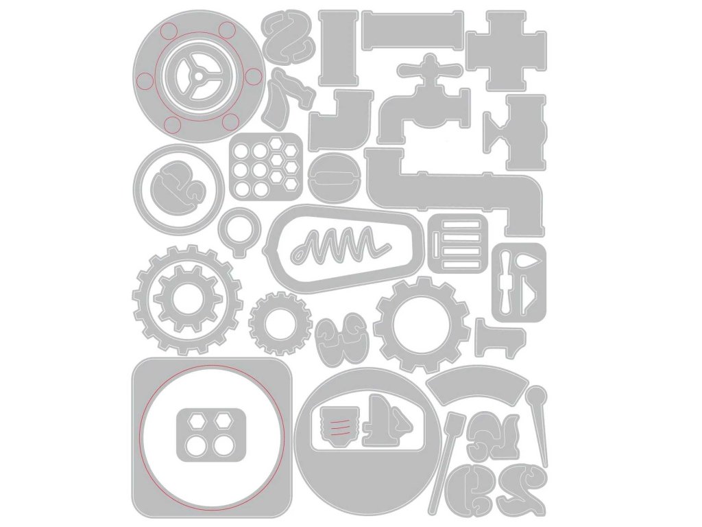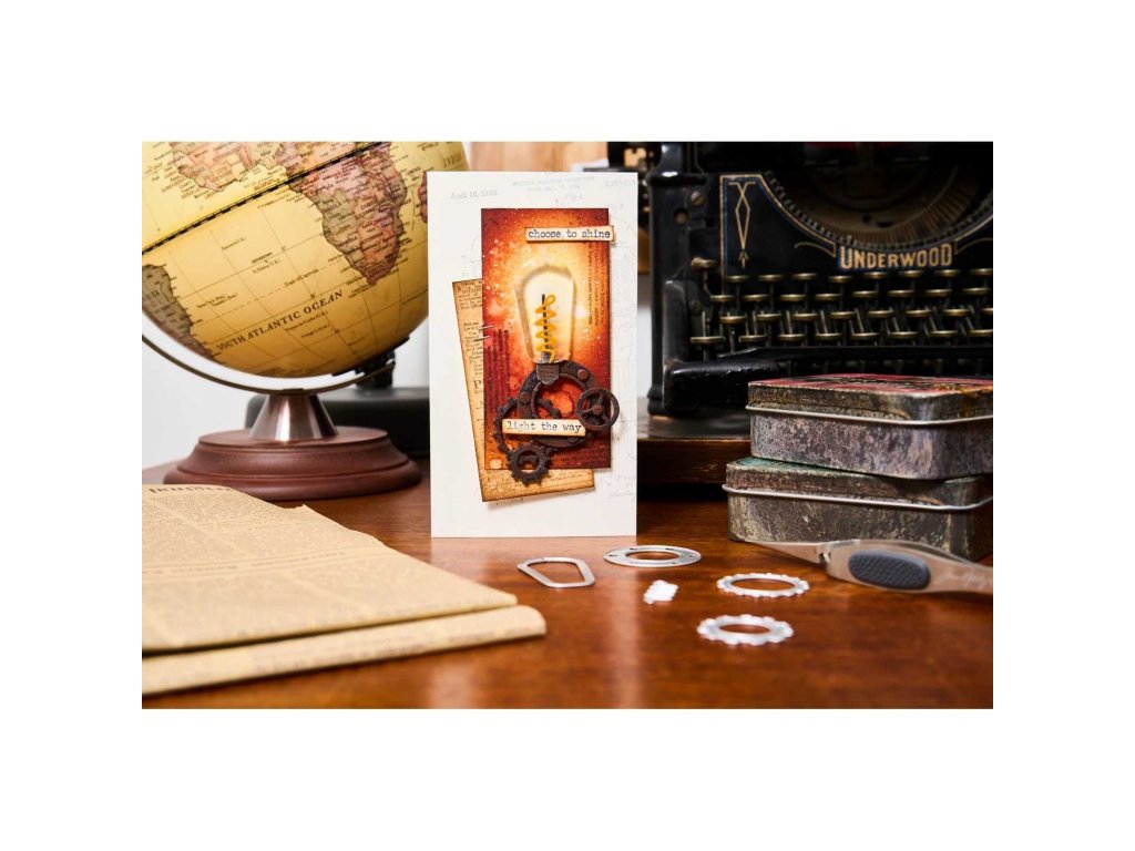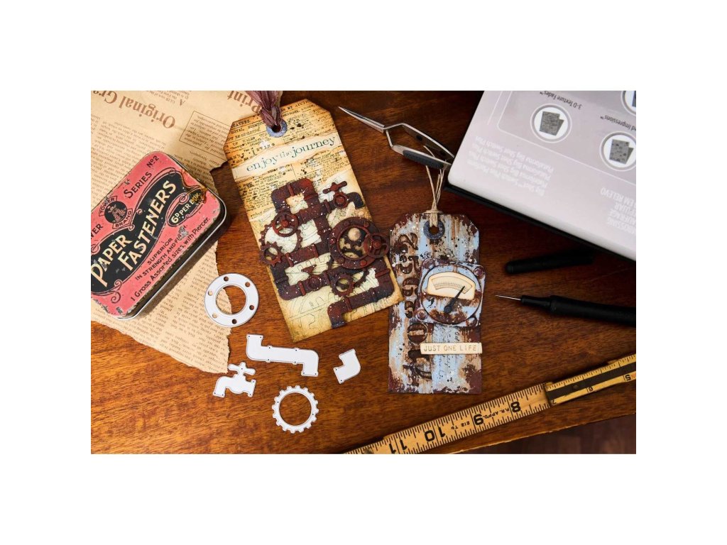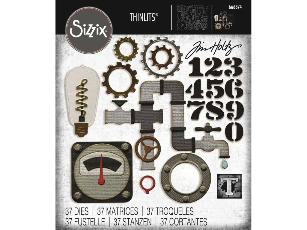 Rozsáhlá sada kovových vyřezávacích šablon z řady Thinlits od značky Sizzix s originálním industriálním designem Tima Holtze. Set "Vault Industrial" obsahuje 37 detailních motivů inspirovaných ozubenými koly, technickými prvky a steampunk estetikou. Ideální pro tvorbu přání, alb, deníků, dekorací a projektů ve vintage, industriálním nebo technickém stylu.